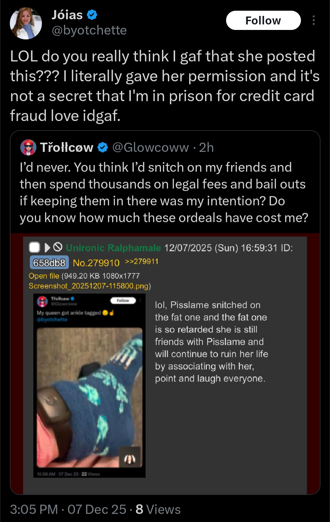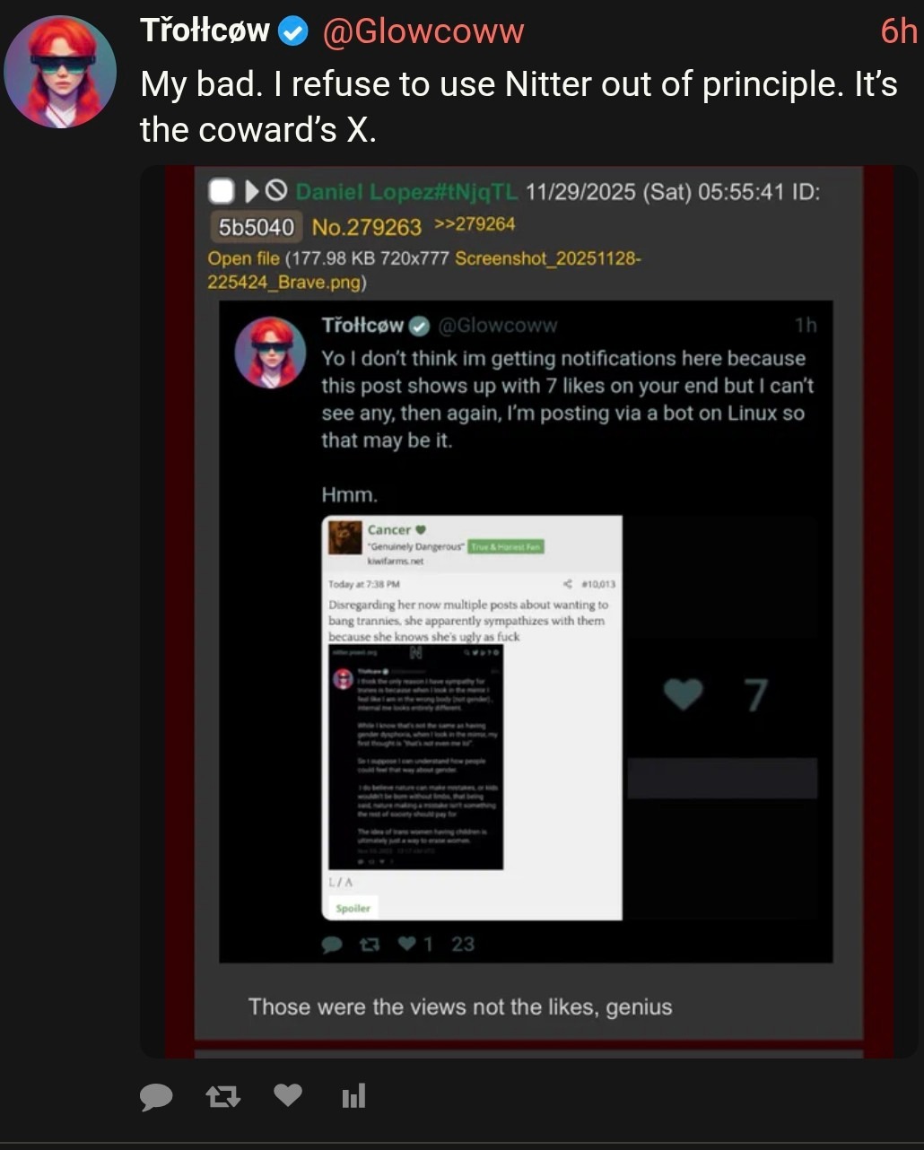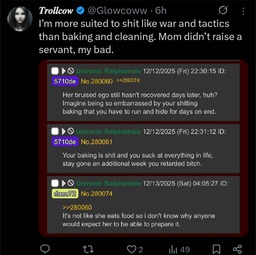 I am a woman, yes, but I am also a warrior, a warrior who has faced the darkness and emerged victorious. I have faced the ugliness of the world, the ugliness of the incels, and I have emerged unscathed. I have faced the darkness of the internet, the darkness of the discord, and I have emerged unscathed. I have faced the darkness of my own mind, the darkness of my own soul, and I have emerged unscathed.